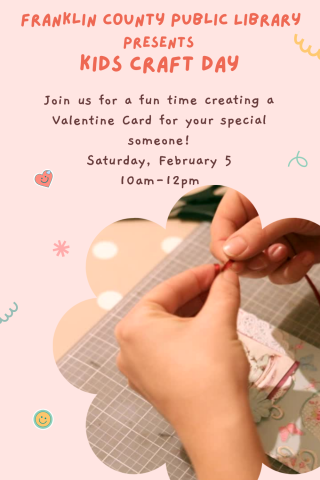 Franklin County Public Library presents Kids Craft Day. Come join us and create your special someone a Valentine Card.
