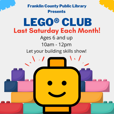 Calling all Lego builders. Let your building skills show! Children ages 6 and up.