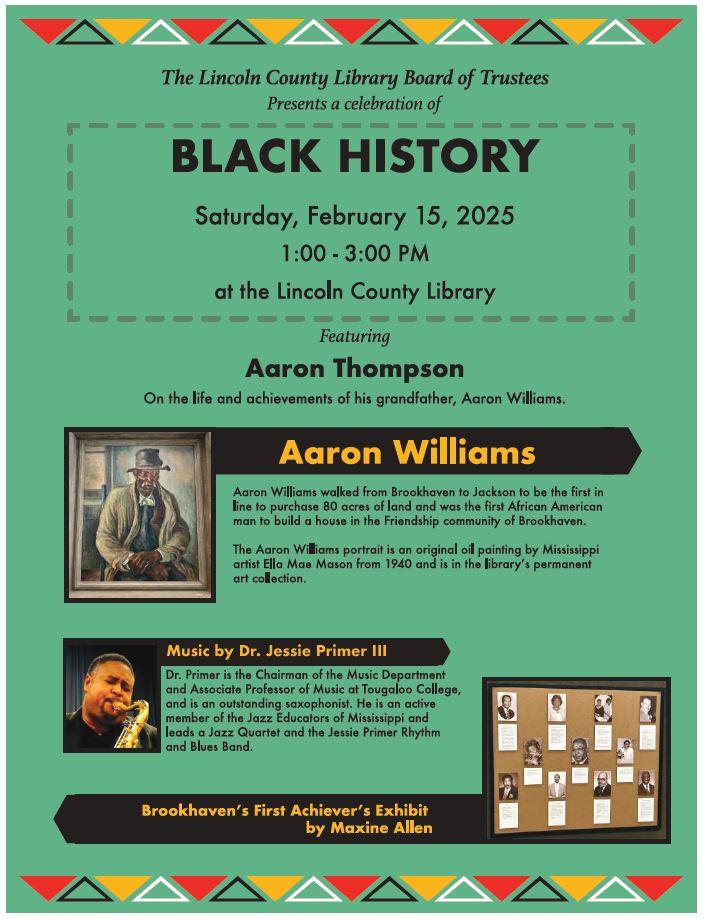 Green backgroud with black writing with pictures of Aaron Williams and Dr. Jessie Primer III